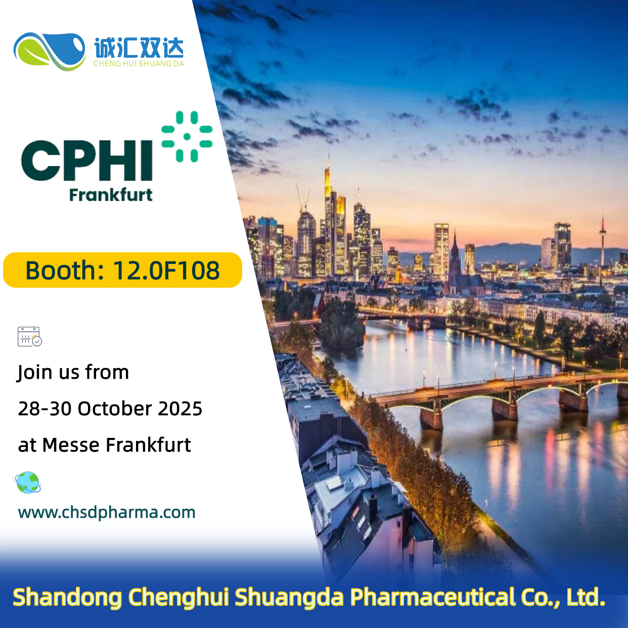 2025年10月28-30日,全球制藥行業(yè)矚目的世界制藥原料歐洲展覽會(huì)(CPHI Worldwide Europe)將在德國(guó)法蘭克福展覽中心(Messe Frankfurt GmbH, Messeplatz 1, 60327 Frankfurt am Main, Germany)盛大開幕。作為醫(yī)藥原料領(lǐng)域規(guī)模大、影響力強(qiáng)的國(guó)際知名展會(huì)之一,本屆展會(huì)預(yù)計(jì)匯聚1800余家全球展商及4.5萬(wàn)名專業(yè)觀眾,覆蓋原料藥、生物技術(shù)、制藥設(shè)備等全產(chǎn)業(yè)鏈。誠(chéng)匯雙達(dá)藥業(yè)誠(chéng)邀您蒞臨12.0F108展位,共探前沿技術(shù)、拓展國(guó)際合作機(jī)遇。