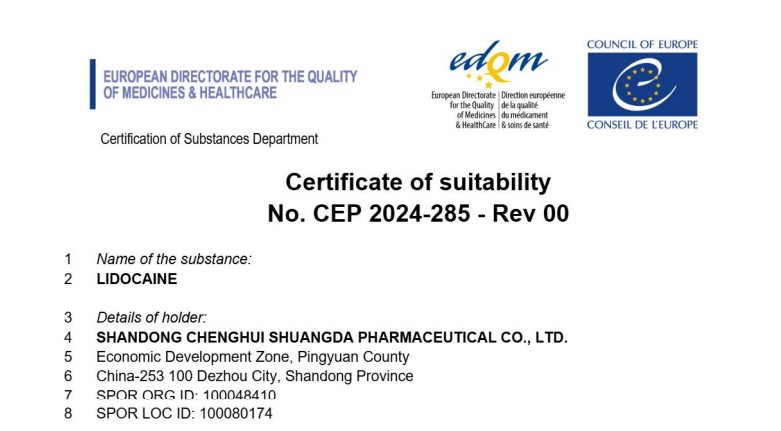 2025年10月22日,我公司原料藥2025年10月9日,我公司原料藥利多卡因歐洲CEP注冊(cè)獲批,并已收到歐洲藥品質(zhì)量管理局(EDQM)頒發(fā)的歐洲藥典適用性證書(CEP證書)。